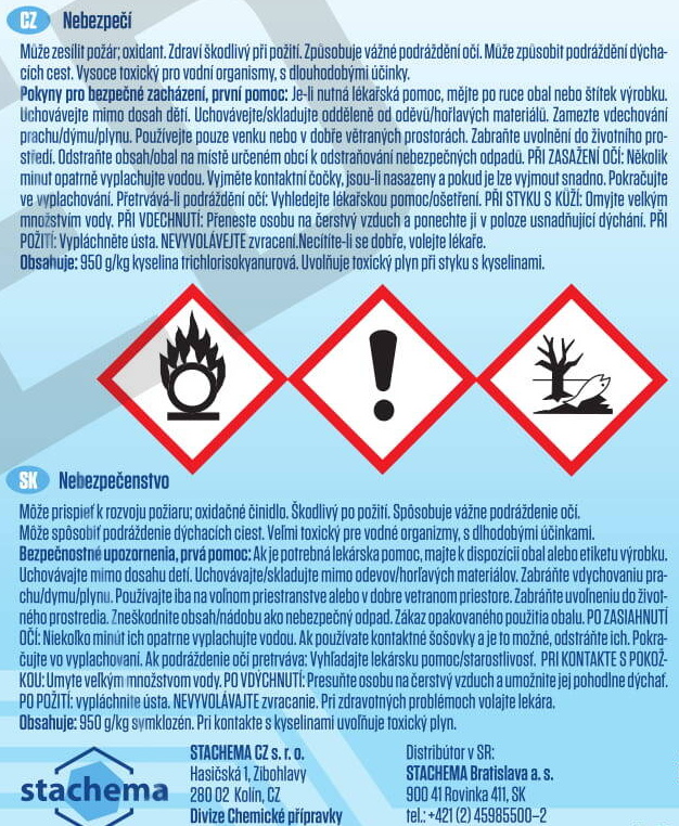 Návod k použití: Před prvním použitím chlorových tablet vždy upravte hodnotu pH na 6,8–7,6 a proveďte počáteční šokovou dezinfekci vody přípravkem Laguna Pool Chlor Start. Od následujícího dne dávkujte tablety sběračem, plovákem nebo jiným dávkovačem při zapnutém filtračním zařízení. Je nutné udržovat obsah aktivního chloru v rozmezí 0,3–0,8 mg/l a pH v rozmezí 6,8 – 7,6. Obsah chloru a hodnotu pH kontrolujte 1xtýdně pomocí testerů.
