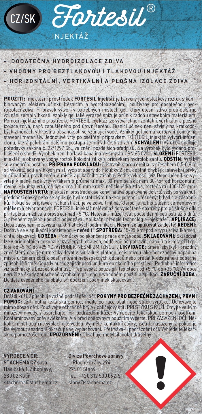 Fortesil Injektáž zdiva s kombinovaným efektem (těsnícím a hydrofobizačním) pro dodatečnou hydroizolaci zdiva. Tekutá hydroizolace ve zdivu vytváří gel jako účinnou ochranu proti vodě a ochranu proti radonu s dlouhou životností. Určený pro hydroizolaci základů, hydroizolaci podlah a veškerého zdiva. Přípravek Fortesil chemická injektáž zdiva vytvoří infuzní clonu, která spolehlivě brání pronikání vlhkosti.