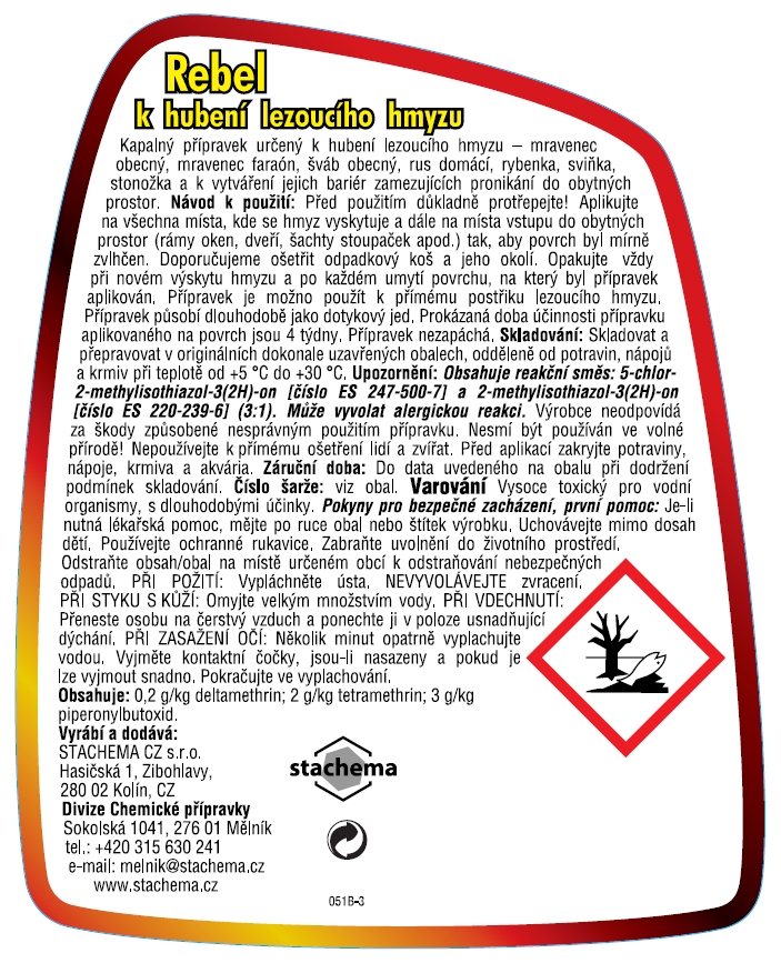 Rebel - přípravek určený především proti hmyzu lezoucímu - včetně všech druhů mravenců, švábů, rybenek, blech, škvorů, sviněk, molů apod. Postihuje veškerý lezoucí hmyz, který proniká do obytných a užitných prostor. Rebel spolehlivě působí až 4 týdny! Rebel k hubení lezoucího hmyzu nezapáchá a jeho aktivní složky nezatěžují životní prostředí, rozkládají se na neškodné produkty. Použití vhodné pro hotely, ubytovny, domácnosti, výrobní a technické provozovny apod. Přípravek je velmi kvalitním a ověřeným produktem na trhu.