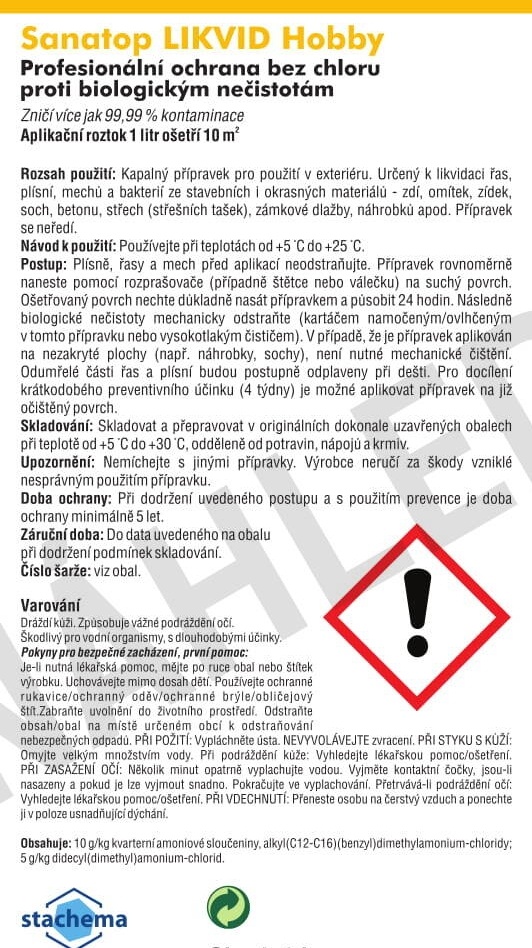 Sanatop Likvid HOBBY je kapalný aplikační přípravek určený k odstranění mechu, lišejníku, řas, plísní, bakterií z minerálních stavebních i okrasných materiálů jako jsou zdi, omítky, beton, kámen atd. Zvláště vhodný pro odstranění mechu na střeše – čištění střech, odstranění mechu ze zámkové dlažby, náhrobků, zídek, soch a jiných prvků umístěných v exteriéru. Sanatop Likvid HOBBY nemá bělící účinek!
