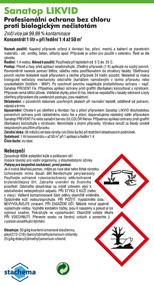 Sanatop Likvid 1:4 - mytí a čištění fasády 5l (doprodej) Sanatop Likvid koncentrát 1:4 přípravek určený k likvidaci a odstranění mechu, lišejníků, řas a plísní v exteriéru staveb. Produkt je zvláště vhodný k mytí a čištění fasády, čištění střech, zídek a jiných minerálních stavebních povrchů. Moderní složení s intenzivním účinkem, neobsahuje chlor. Sanatop Likvid ošetří z 5l v případě mytí a čištění fasády, střechy až 250m2 plochy.