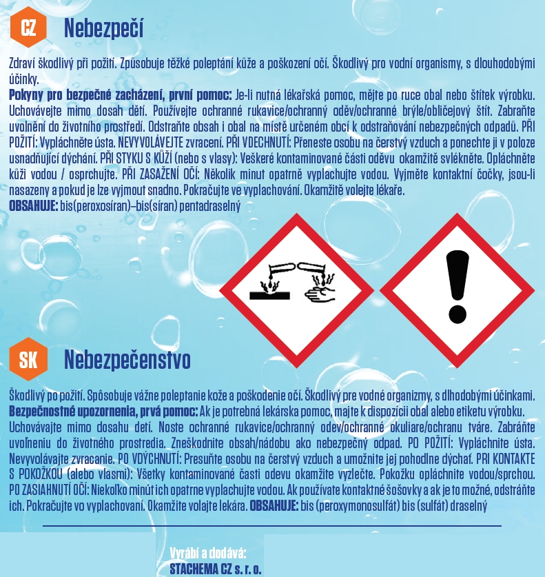 Upozornění: Přímý kontakt s folií může způsobit její vybělení. Nevhazujte tablety přímo do bazénu! Neprovádějte chlorovou dezinfekci současně s kyslíkovou.