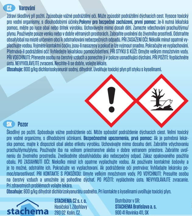 Použitím 2,2 g přípravku na 10 m3 vody se zvýší obsah aktivního chloru o cca 0,1 mg/l.