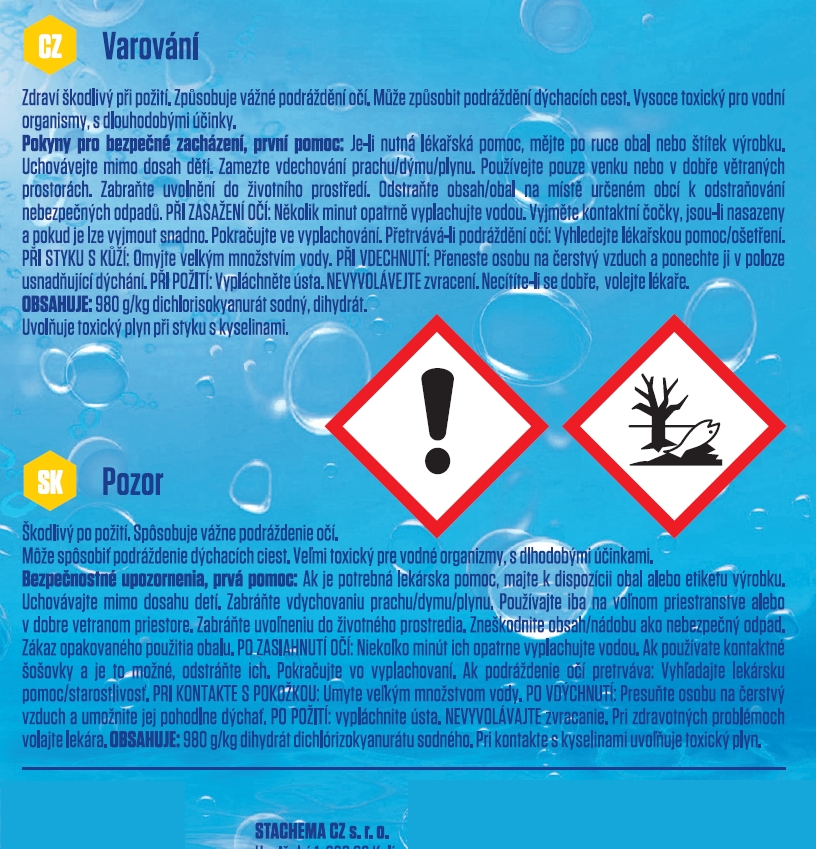 Přípravek Laguna Chlor šok je určen pro šokovou (rychlou) dezinfekci bazénové vody, při uvedení bazénu do provozu, při extrémních podmínkách provozu bazénu (vysoké teploty, velký počet koupajících, bouřkové počasí apod.).