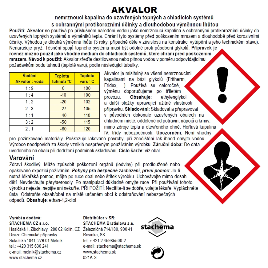 Akvalor je koncentrovaná nemrznoucí kapalina na bázi glykolů se spektrem antikorozních přísad. Přípravek je určen do uzavřených topných nebo chladících systémů a výměníků tepla, které chrání před poškozením mrazem a před korozí. Nemrznoucí směs - chladící kapalina Akvalor vykazuje v topných a chladících systémech dlouhodobou minimálně tříletou životnost a ochranu.